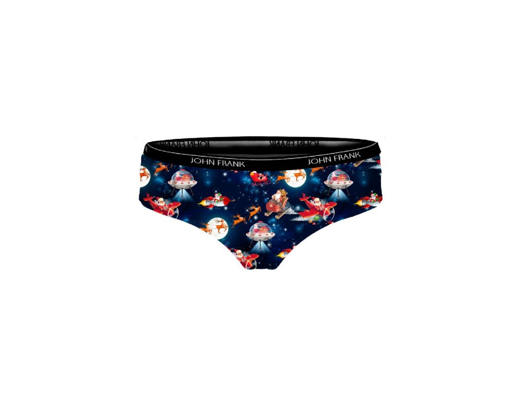 Dámské kalhotky střihu hipster od značky John Frank z limitované vánoční kolekce (omezené množství, bez možnosti doplnění). Bavlněné kalhotky s módně zpracovaným potiskem jsou velmi příjemné na dotek a pohodlné při nošení. Jemná, středně široká guma v pase má kolem logo John Frank. Do vnitřního dílu je zapracován bavlněný klínek pro komfortní nošení. Slaďte se v kolekci ON & ONA, dámské kalhotky i pánské boxerky naleznete u nás v jednom designu, buďte IN s partnerem.