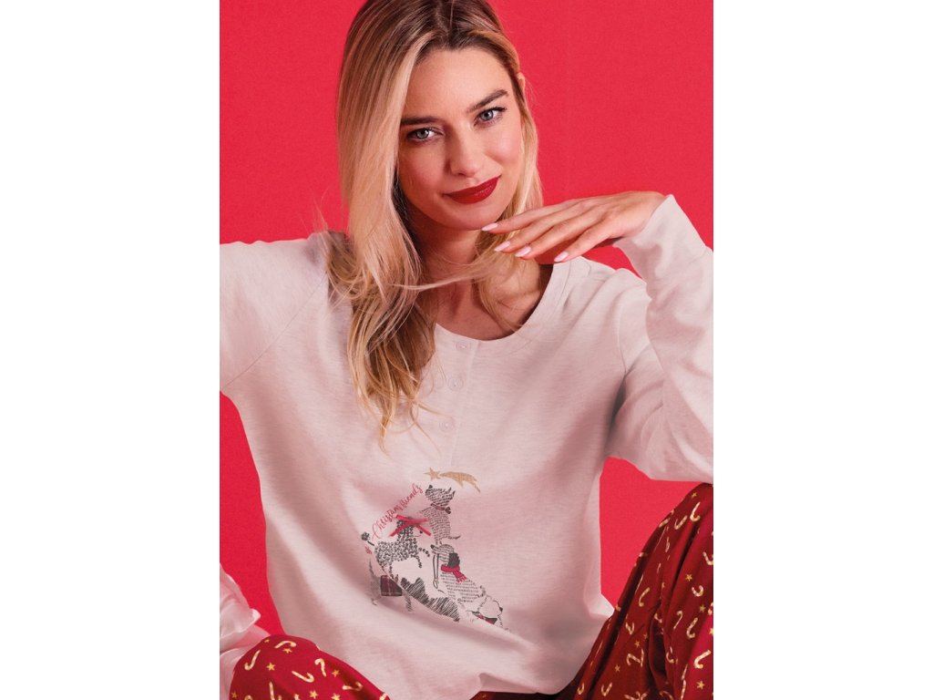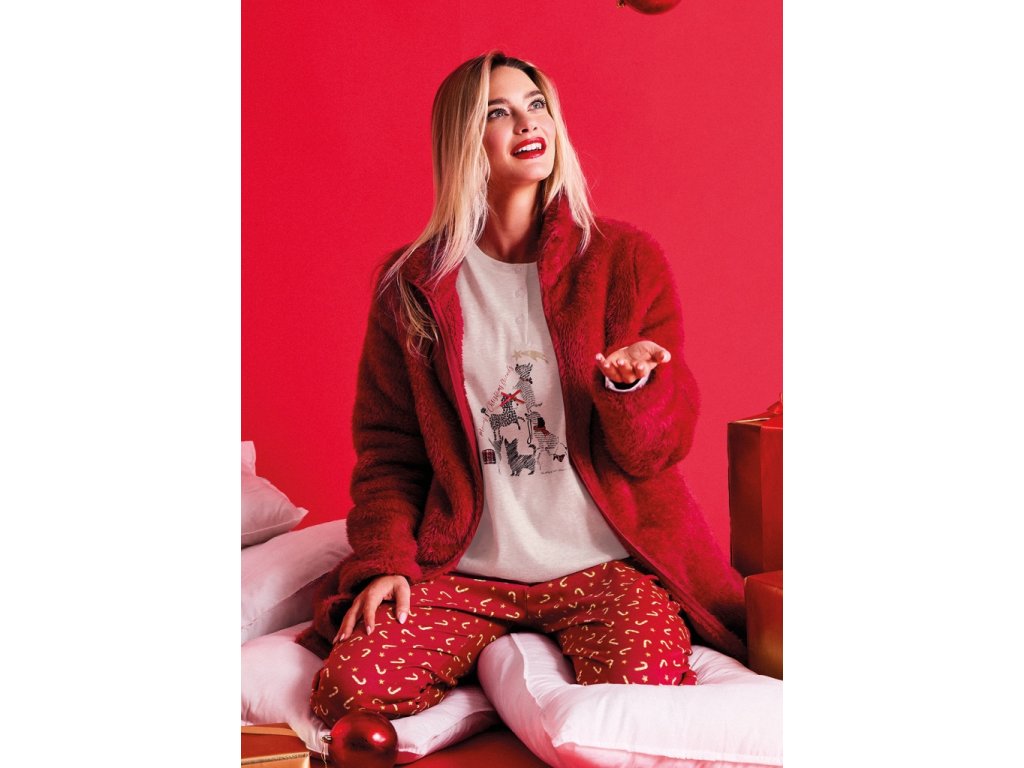 Objevte kouzlo zimních večerů s dámským pyžamem Infiore, které spojuje pohodlí, eleganci a sváteční atmosféru. Tento oblíbený model z vánoční kolekce značky Infiore je navržen pro ženy, které si chtějí užít maximální komfort a současně vypadat stylově i během domácí pohody. Pyžamo je vyrobeno ze 100% kvalitního bavlněného interlocku, který je známý svou jemností, pružností a vyšší gramáží. Tento materiál krásně hřeje, ale zároveň zůstává prodyšný – perfektní volba na chladnější zimní noci i pohodlné odpočinkové dny doma. Horní díl pyžama má moderní Serafino střih s kulatým výstřihem a krátkou légou na knoflíčky. Dlouhé kalhoty s měkkými náplety u kotníků zajišťují, že se nohavice nevyhrnují a během noci drží na místě. Střih je volný a pohodlný, nepne ani netlačí, takže poskytuje maximální volnost pohybu.