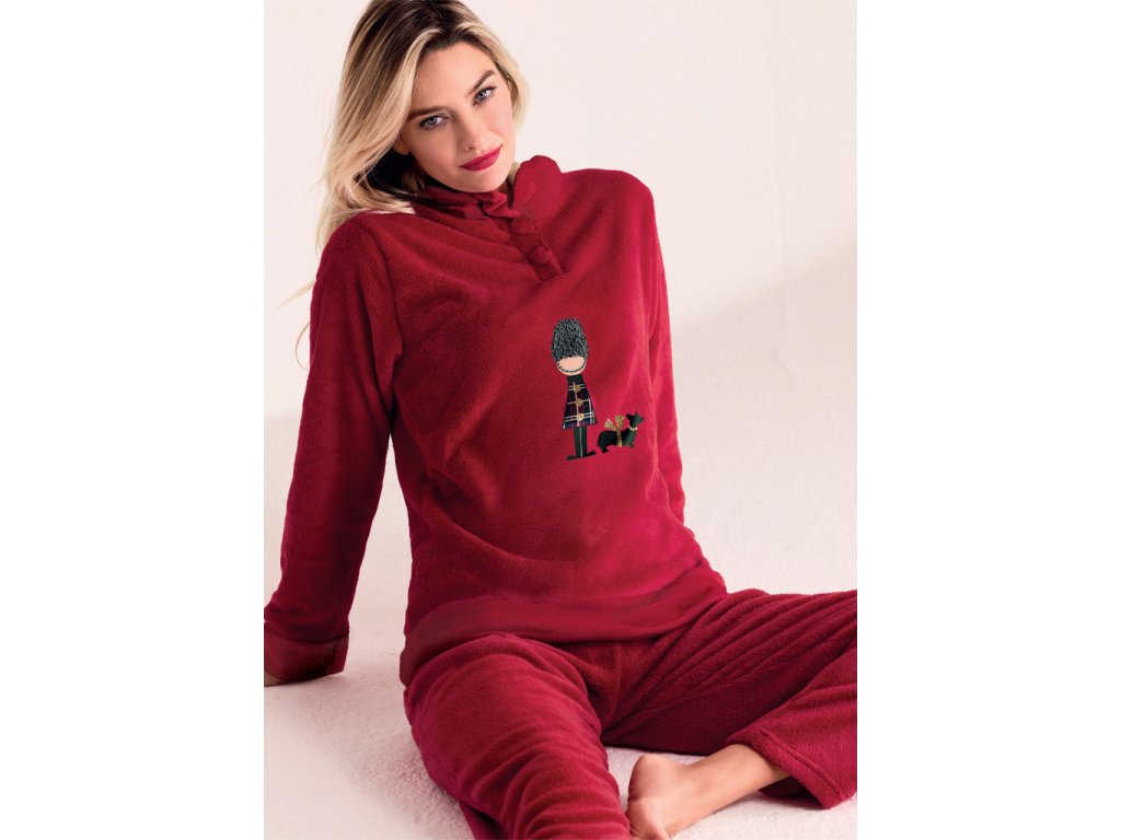 Dámské pyžamo Infiore z hebkého a hřejivého materiálu je ideální volbou pro chladnější dny. Vrchní díl v sytě červené barvě má dlouhé rukávy, stojáček se zapínáním na knoflíčky a ozdobný motiv postavičky s pejskem, který dodává pyžamu hravý a zimní nádech. Kalhoty jsou dlouhé, měkké a příjemně elastické, takže se skvěle přizpůsobí při nošení. Komfortní komplet, který zahřeje a zároveň působí roztomile.