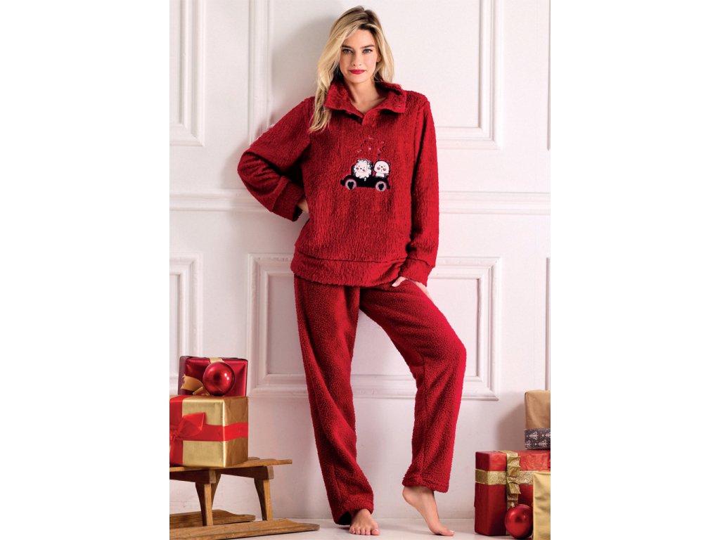 Dámské domácí pyžamo Infiore v sytě červené barvě je ideální volbou na zimní období i vánoční pohodu. Je vyrobené z velmi měkkého a hřejivého „teddy“ materiálu, který příjemně zahřeje a zajišťuje maximální komfort. Vrchní díl má límeček se zapínáním na knoflíky a na přední straně zdobí roztomilá výšivka dvou pejsků v autíčku. Kalhoty mají pohodlný volný střih a elastický pas. Skvělý set pro odpočinek doma, zimní večery i jako milý dárek.