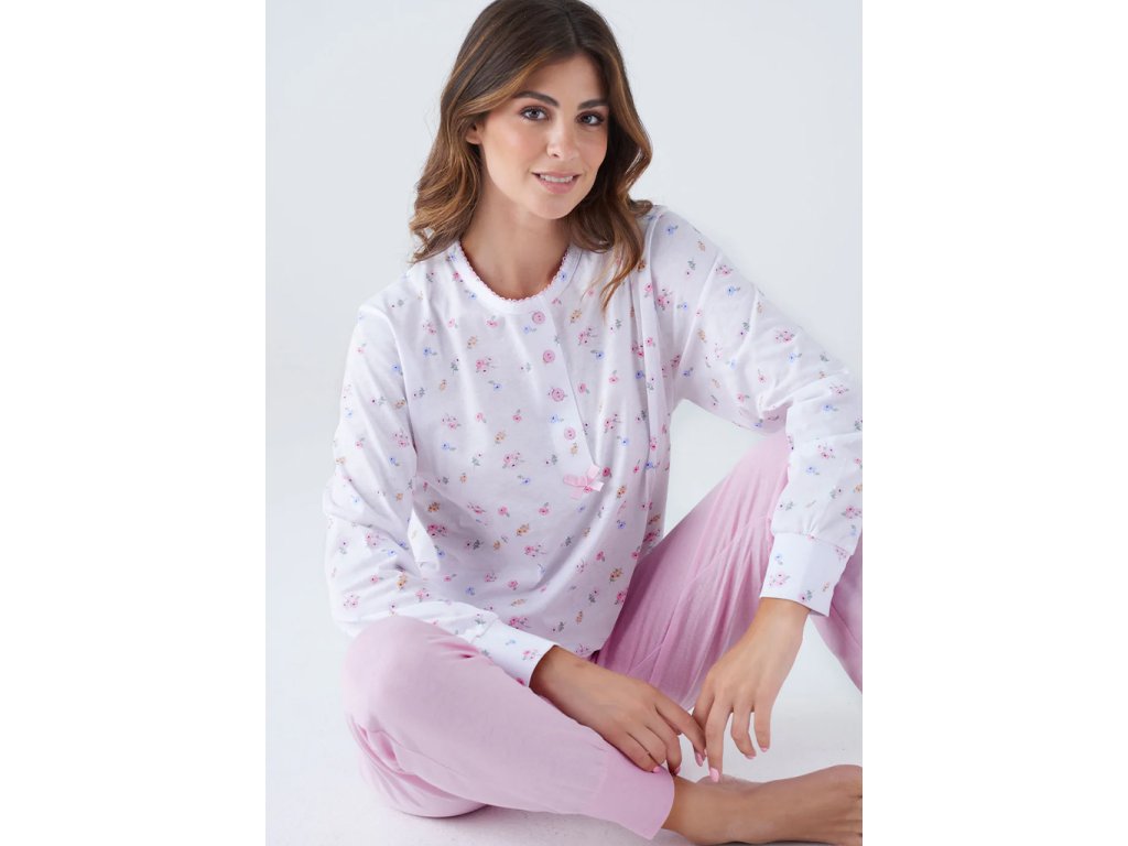Dámské pyžamo Karelpiu spojuje jemnost, pohodlí a roztomilý design. Horní díl s dlouhým rukávem je zdoben drobným květinovým potiskem, ozdobnými knoflíčky a decentní mašličkou u výstřihu. Příjemný bavlněný materiál zajišťuje maximální komfort během spánku i lenošení. Kalhoty v jednobarevném provedení s pružnými lemy doladí celý outfit k dokonalosti. Pyžamo je dostupné ve dvou barevných variantách – něžné růžové a svěží modré.