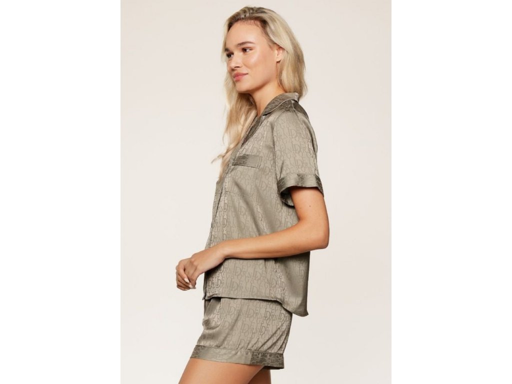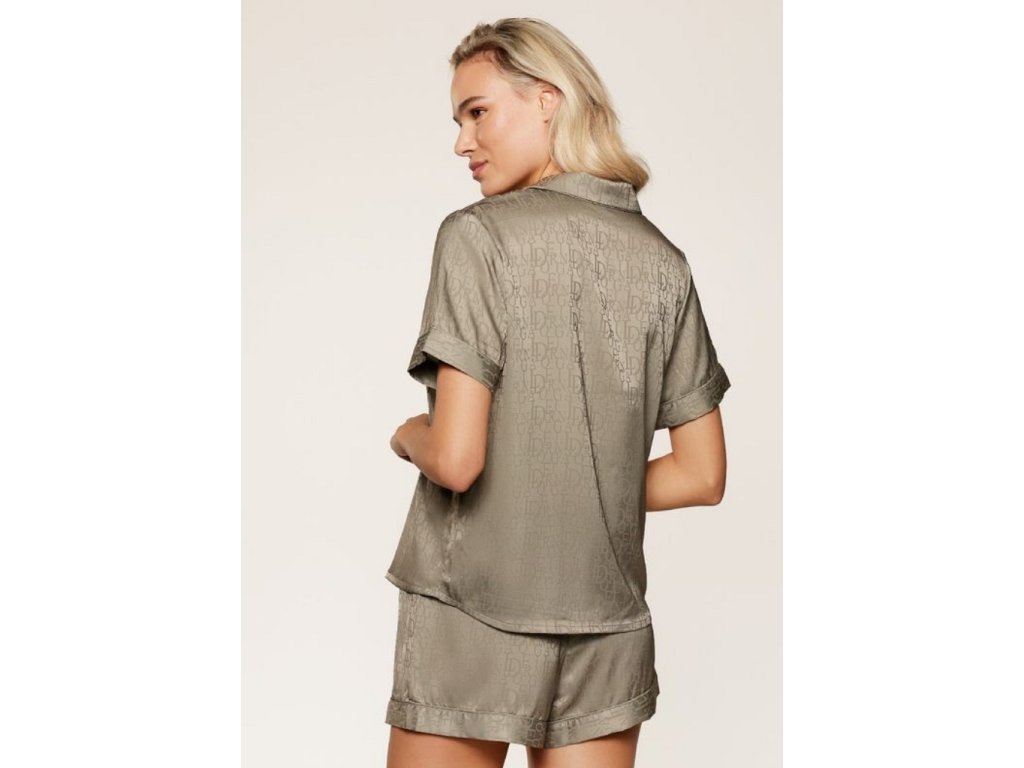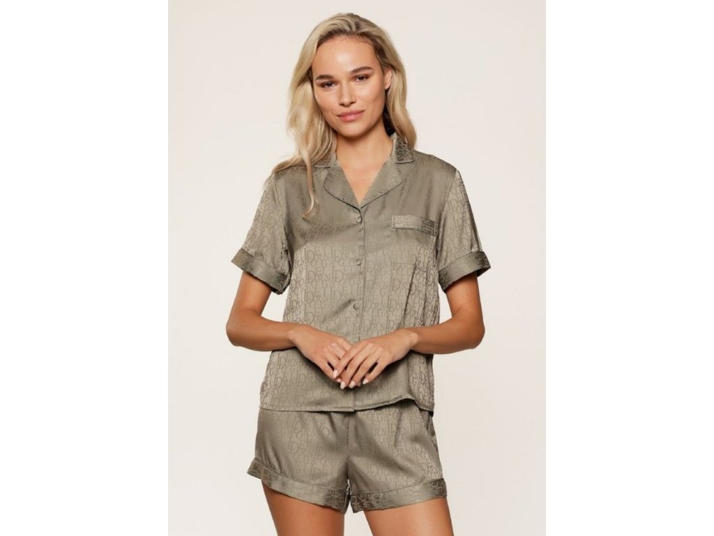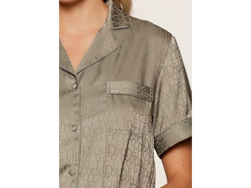 Dámská luxusní pyžamová sada složená z krátkých kalhot a halenky s krátkým rukávem, vyrobená z jemného saténového materiálu, který působí hedvábně na dotek a zajišťuje pohodlí při nošení. Halenka má zapínání na knoflíky po celé délce a na přední straně náprsní kapsičku. Kalhoty disponují elastickým pasem pro pohodlné nošení a rovnými nohavicemi pro elegantní vzhled. Po celé ploše pyžama je tištěné logo „LD“ v tónu barvy pyžama.