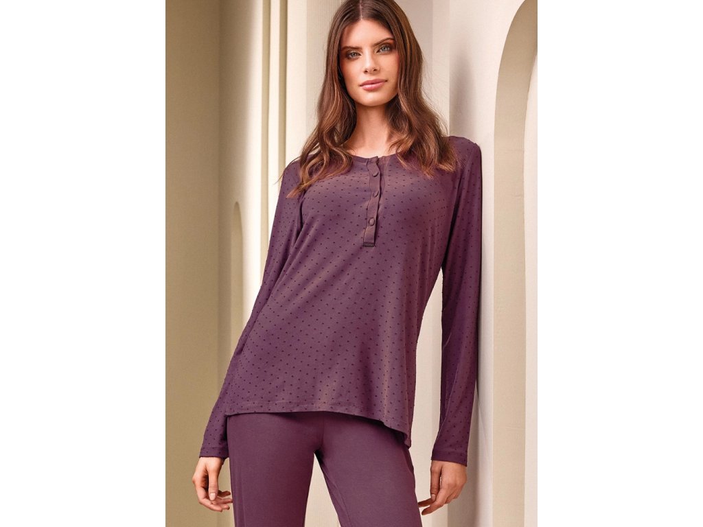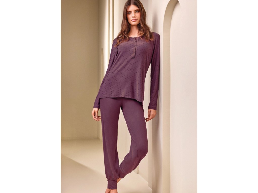 Dámské pyžamo Lormar ve vínovém odstínu je vyrobené z mimořádně příjemného a lehkého materiálu, který zajistí maximální pohodlí během spánku i domácího odpočinku. Horní díl s dlouhými rukávy zdobí jemná struktura drobných puntíků a zapínání na knoflíčky u výstřihu, což dodává modelu elegantní a ženský vzhled. Kalhoty jsou jednobarevné, v pohodlném střihu zakončeném pružnými manžetami, díky kterým dobře drží na místě. Celý set působí velmi jemně, stylově a je ideální na každodenní nošení.