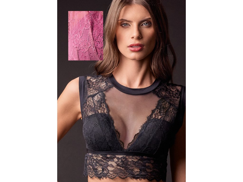 Elegantní krajkový top Lormar spojuje jemnost, smyslnost a moderní design. Přední část zdobí výrazná krajka doplněná transparentním tylem, který vytváří působivý dekolt a dodává celému modelu lehkost. Zadní díl je tvořen kombinací jemné krajky a průsvitného tylu, což zajišťuje vzdušnost a rafinovaný vzhled. Top je navržen bez kostic pro maximální pohodlí a přirozený pocit při nošení. Dostupná růžová varianta odpovídá odstínu z ukázkových fotografií.