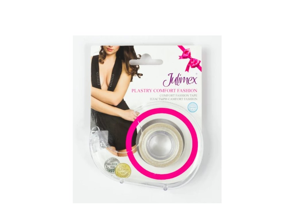 Transparentní 20mm proužky Julimex jsou oboustranně lepící, jedna strana se lepí na tělo a druhá na oblečení. Proužky jsou disktrétním řešení například pro hluboké dekolty nebo odstávající části oblečení. Délka 3m.