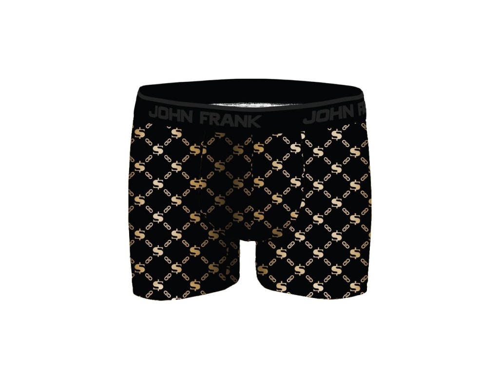 Pánské boxerky John Frank zaujmou výrazným designem se zlatým řetězovým motivem a symbolem dolaru na černém podkladu. Moderní střih perfektně sedí na těle a poskytuje maximální pohodlí při každodenním nošení. Elastický pas s logem John Frank dobře drží, netlačí a dodává boxerkám sportovně-luxusní vzhled. Příjemný, pružný materiál je prodyšný, měkký na dotek a přizpůsobí se pohybu po celý den. Ideální volba pro muže, kteří mají rádi originální spodní prádlo s výrazným stylem.