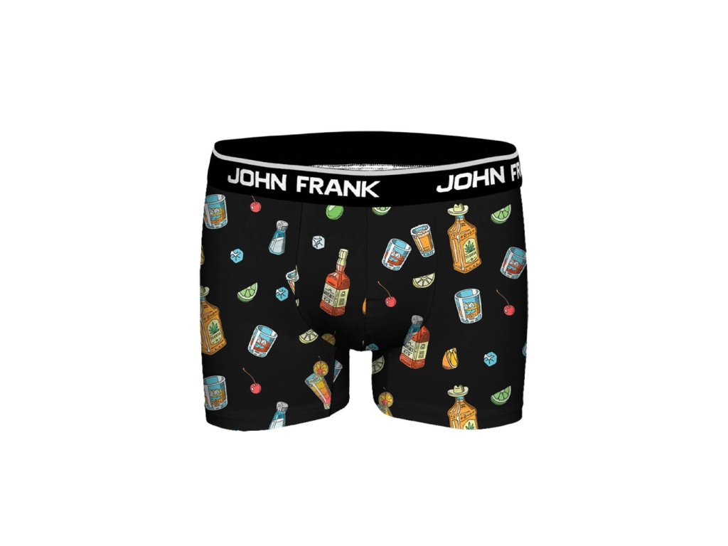 Pánské boxerky John Frank z jemného micromodalu, který je mimořádně příjemný na dotek, prodyšný a perfektně odvádí vlhkost. Materiál se krásně přizpůsobí tělu a drží tvar i při celodenním nošení. Boxerky mají pohodlnou pružnou gumu v pase s logem značky a černý základ zdobený výrazným hravým potiskem drinků, skleniček a ovoce. Stylový a komfortní kousek pro každý den.
