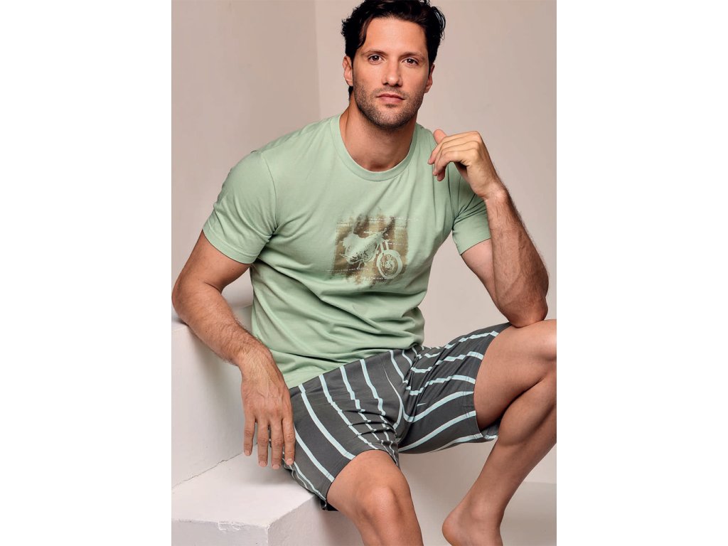 Pánské pyžamo Infiore spojuje pohodlí s moderním designem. Tričko v jemném mátovém odstínu zdobí stylový motorkářský potisk, který dodává sportovní a ležérní nádech. Kraťasy v tmavě šedé barvě s kontrastními pruhy působí svěže a uvolněně. Pyžamo je vyrobeno z příjemného a prodyšného materiálu, ideálního pro každodenní nošení i klidný spánek. Skvělá volba pro muže, kteří chtějí vypadat dobře i doma.