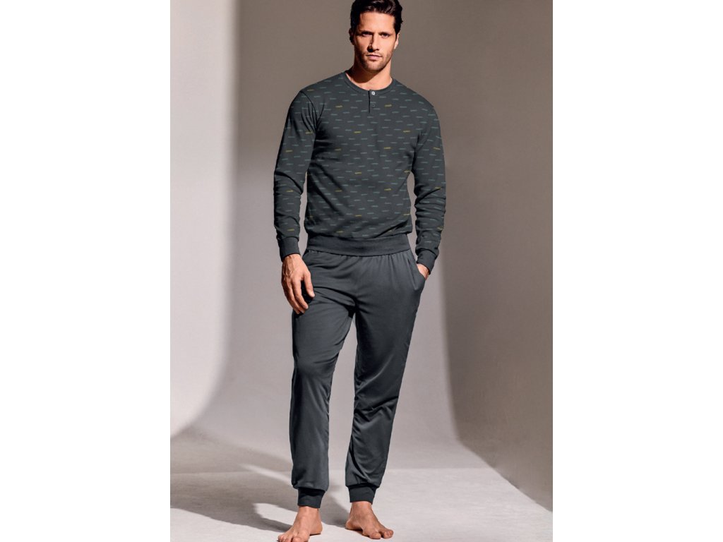 Pánské pyžamo Infiore v tmavě šedém provedení spojuje moderní styl a maximální pohodlí. Horní díl s kulatým výstřihem a krátkým zapínáním na knoflíčky zdobí decentní vzor s drobnými autíčky v kontrastních barvách. Jednobarevné kalhoty mají pohodlný střih a jsou zakončené pružnými manžetami, které zajišťují komfort při nošení. Pyžamo je vyrobeno z měkké a prodyšné bavlny, ideální pro klidný spánek i domácí relax. Baleno v elegantní krabičce, takže se skvěle hodí i jako dárek.