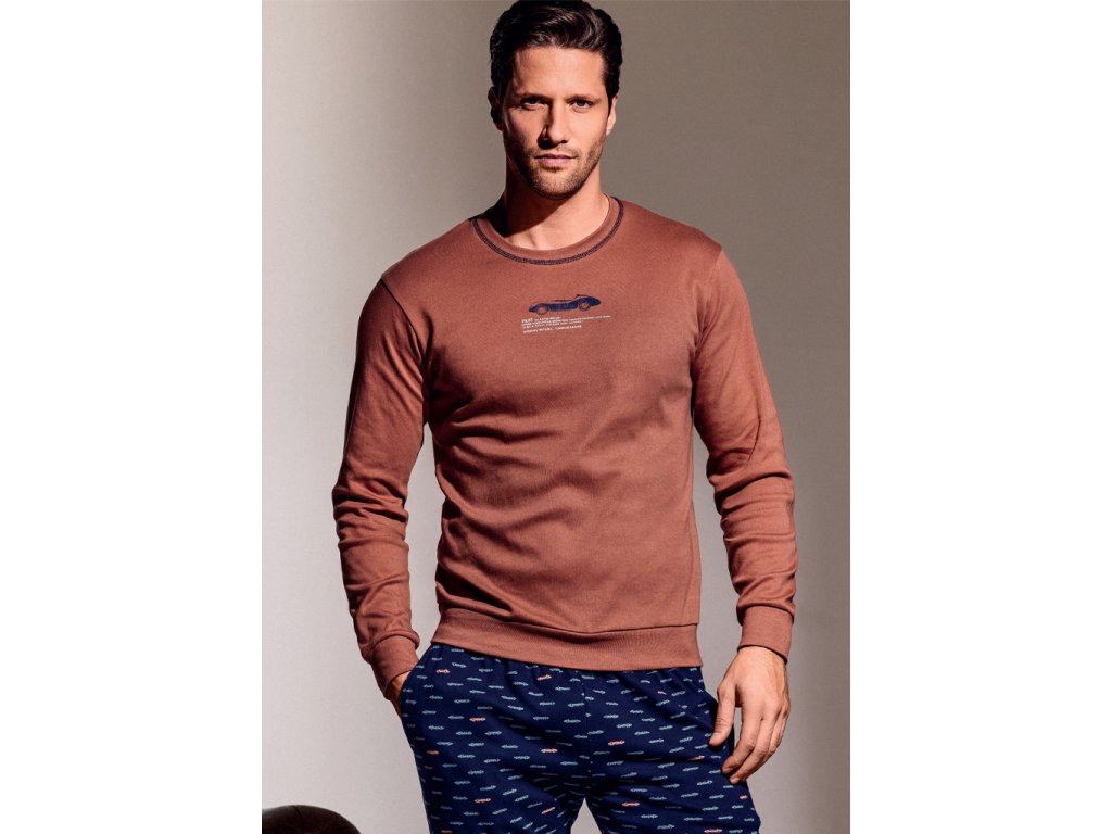 Stylové a pohodlné pánské pyžamo od značky Infiore potěší každého muže, který má rád kombinaci komfortu a moderního vzhledu. Horní díl v teplé hnědé barvě má dlouhé rukávy a decentní potisk s motivem auta na hrudi. Kalhoty v tmavě modrém odstínu zdobí drobný vzor s autíčky a jsou zakončené pružnou manžetou, která zajišťuje pohodlné nošení. Pyžamo je vyrobeno z měkké a prodyšné bavlny, která poskytuje maximální komfort po celou noc. Ideální volba pro chladnější období i pohodlný domácí odpočinek. Pyžamo je baleno v praktické krabičce, takže se skvěle hodí i jako dárek.