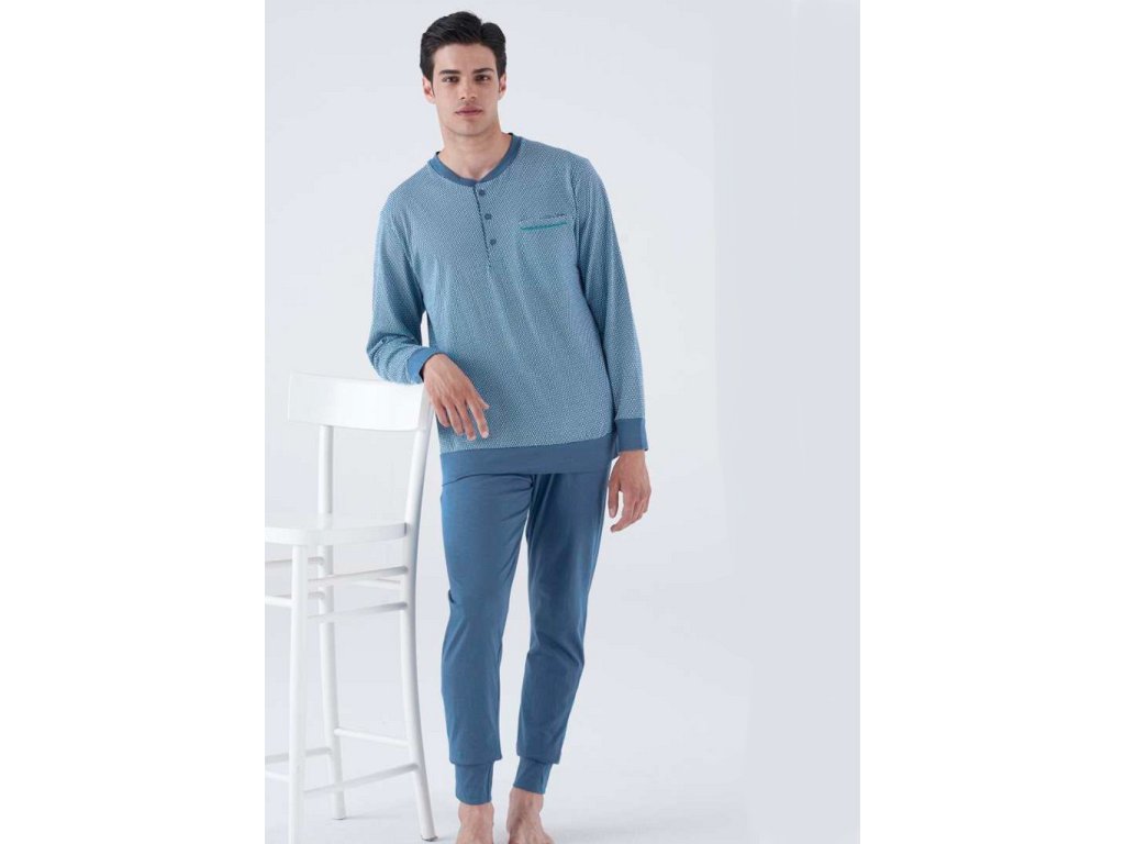 Pánské bavlněné pyžamo italské značky Karelpiu. Pyžamo je ze 100% bavlny, velmi příjemné a pohodlné. Tričko má dlouhý rukáv, kulatý výstřih a légu se třemi knoflíky. Na levé přední straně je našitá kapsička. Volné kalhoty mají v pase pohodlnou pružnou gumu, nohavice jsou ukončeny širokou manžetou.