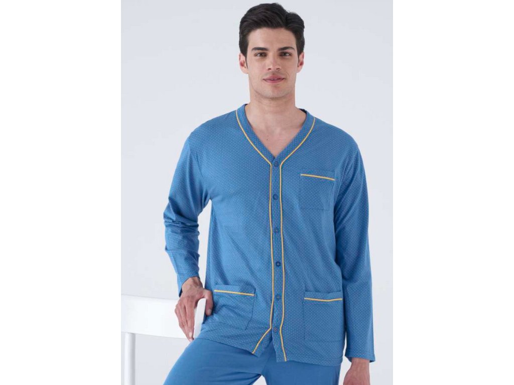Pánské pyžamo značky Karelpiu. Pyžamo se skládá z kabátku, který je celopropínací na knoflíky, výstřih je do "V". Na levé straně je našitá kapsička a kapsičky jsou našité i ve spodní části. Kalhoty jsou v pase do pružné obšité gumy. Pyžamo nemá žádné lemy a je pohodlné na nošení, je ušité z příjemné bavlny.