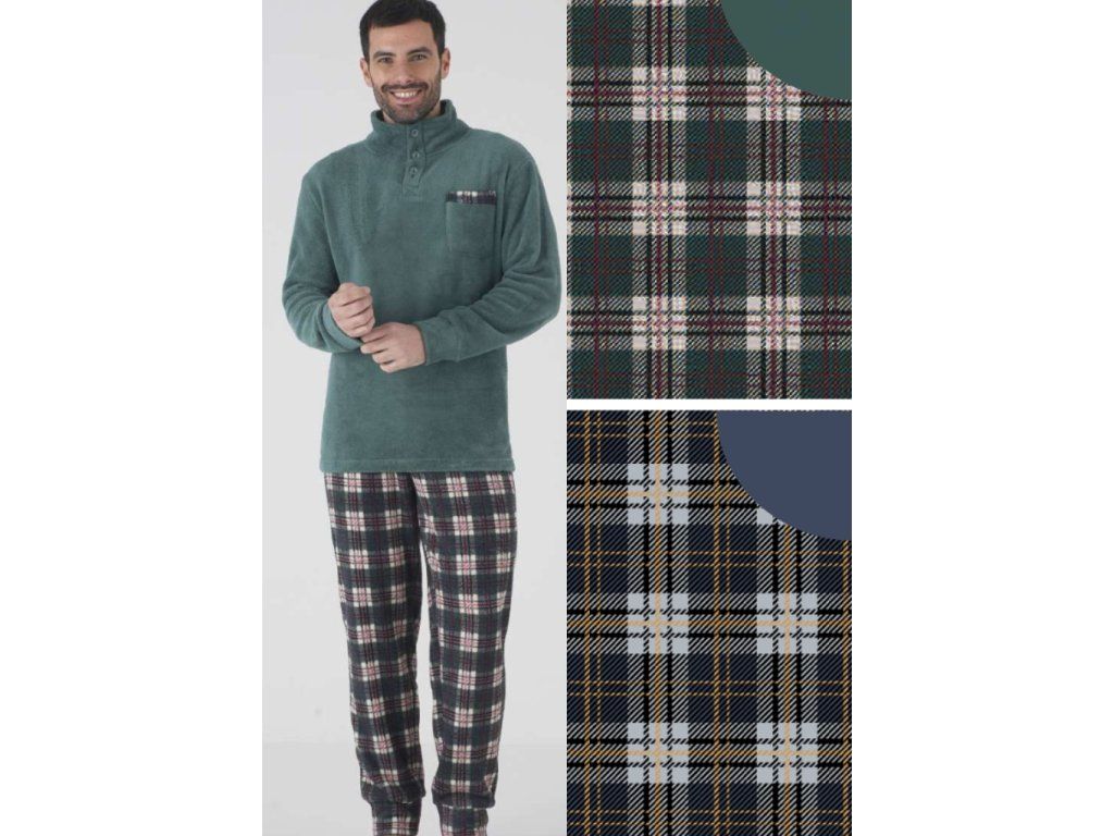 Pánské pyžamo od italské značky Karelpiu. Pyžamo je jemné, lehké a hřejivé. Má zapínání u krku na tři knoflíky a vpředu našitou kapsičku. Rukávy jsou ukončené do manžety. Kalhotky mají v pase širší gumu.